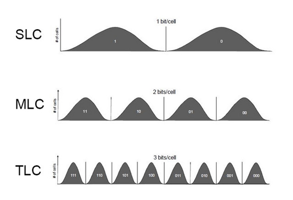 這幾種存儲單元在生產(chǎn)成本和使用壽命上有明顯區(qū)別,層數(shù)越高的存儲單元,它的單位存儲成本越低,壽命和讀寫性能也越低。